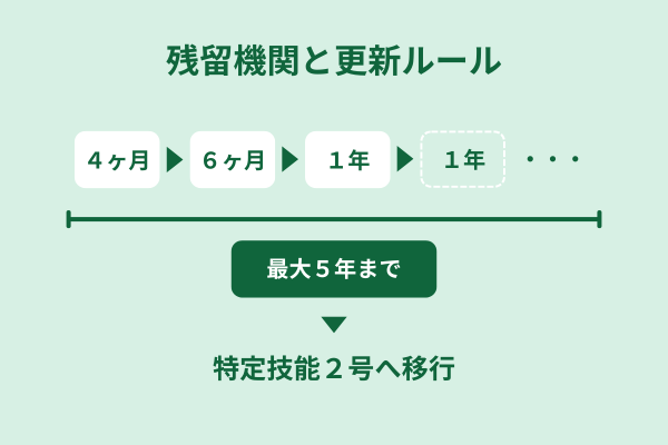 特定技能1号の在留期間は、1年、6か月、または4か月ごとの更新となります。