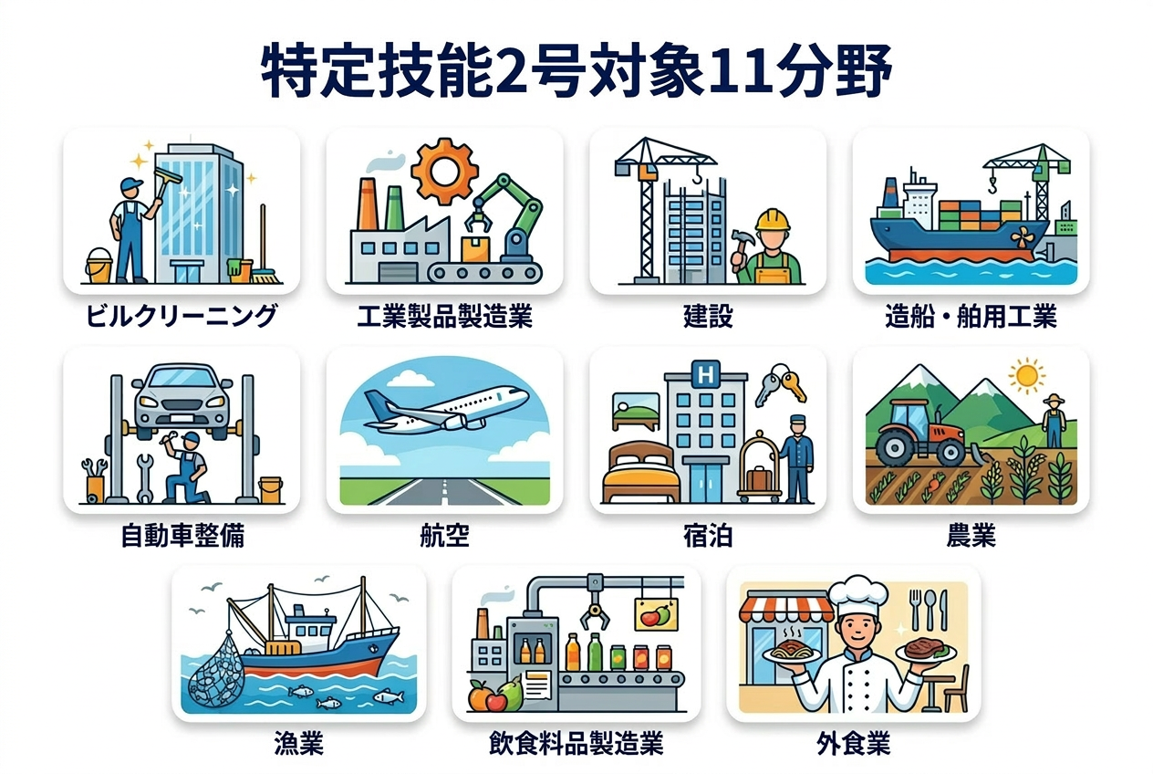 2026年現在、特定技能2号の対象となっているのは、以下の11分野です。